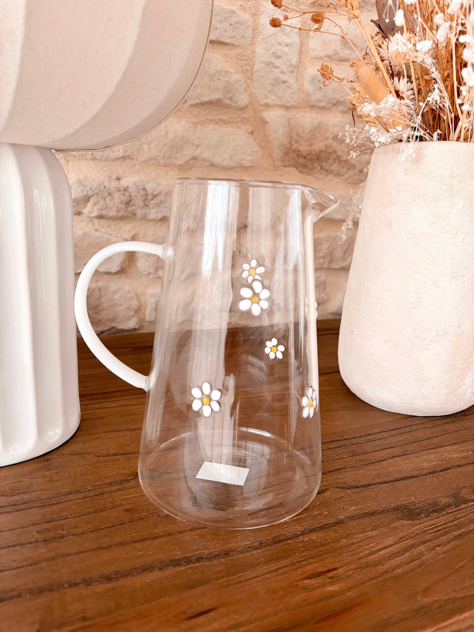 Le Pichet Buzz de Bloomingville est un pichet en verre à la finition transparente, doté d’une base large, d’une anse courbée et de motifs floraux dans des tons blanc et jaune. De légères variations de motif et d’intensité de couleur peuvent apparaître, rendant chaque pièce unique.
