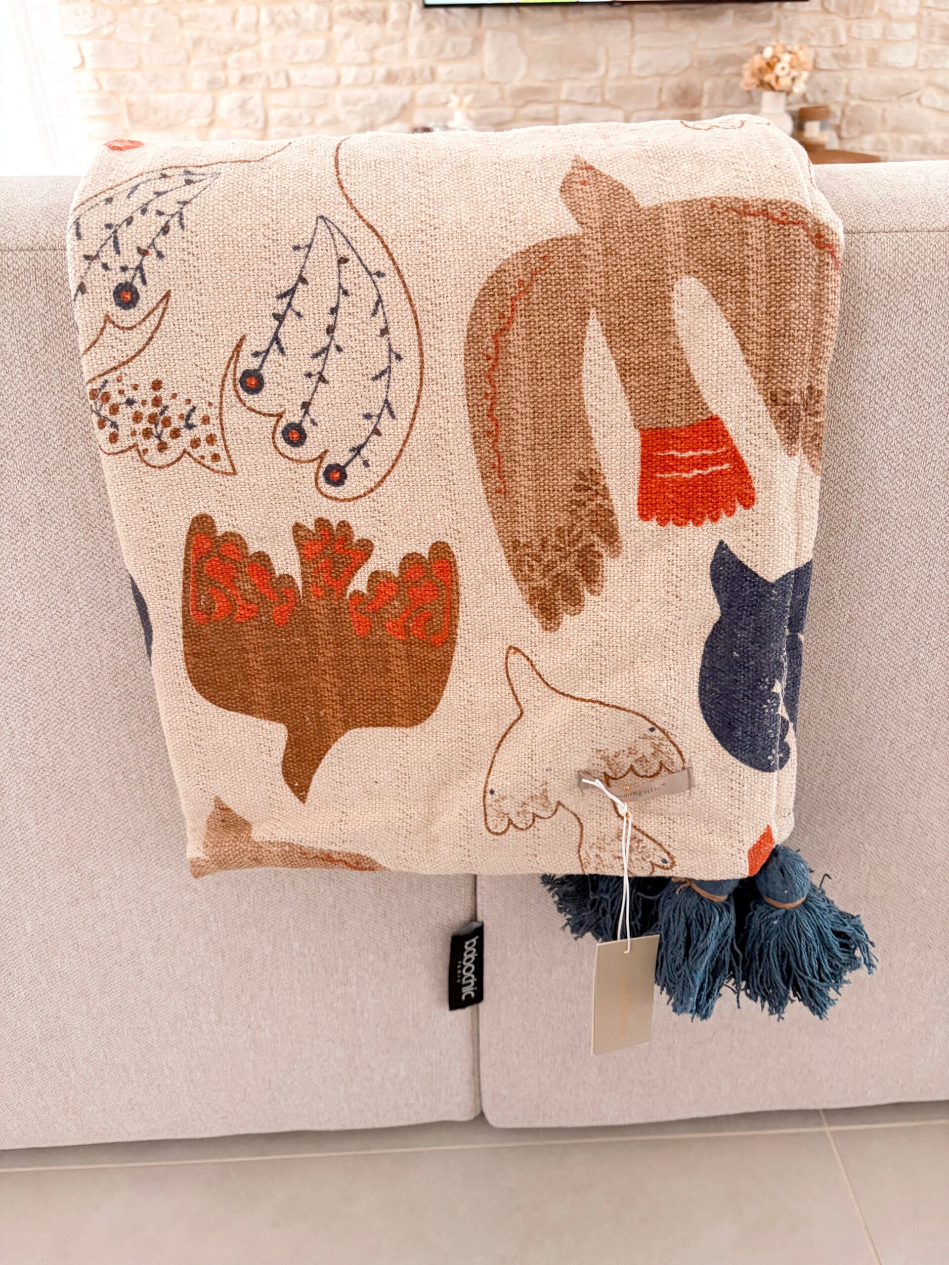 Le Plaid anniversary oiseaux de Bloomingville est tissé à partir de coton recyclé et présente un imprimé graphique dans des tons chauds et colorés. Les pompons bleus dans les coins ajoutent un contraste ludique et complètent l’aspect décoratif.