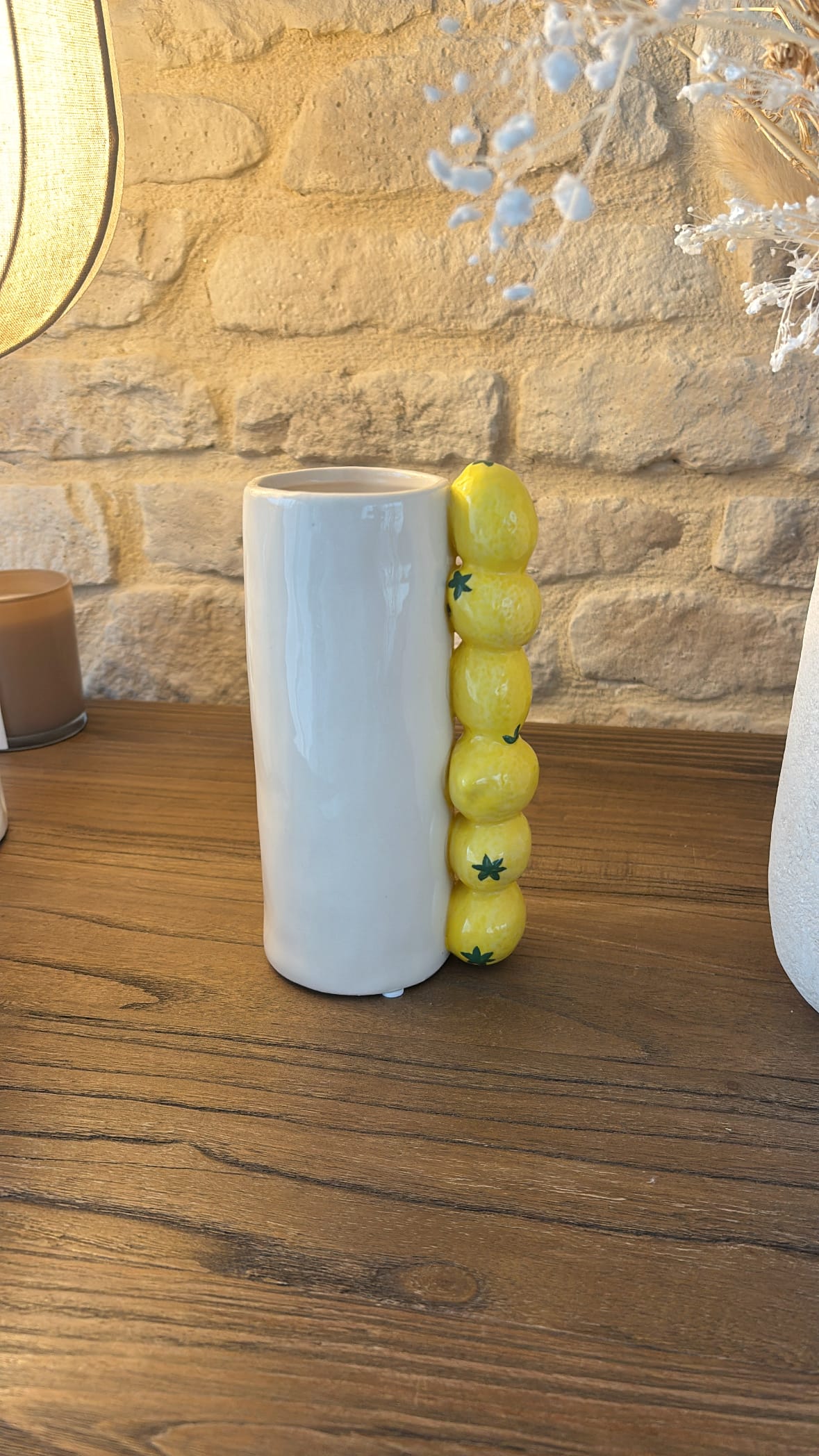 Ce vase en barbotine, orné de motifs de citrons vibrants, est idéal pour insuffler une énergie joyeuse et rafraîchissante dans tout espace intérieur. Parfait pour les arrangements floraux estivaux ou comme élément décoratif distinctif